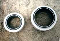 マンホール躯体の外壁に、パイプを差し込んだのち貼りつけます。 接着には専用接着剤を用い、躯体に番線で締め付けます。